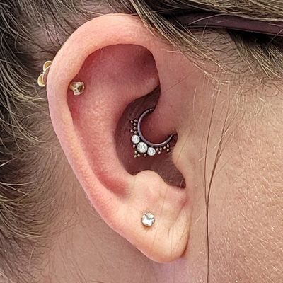 The daith is one of the most striking and distinctive piercings you can choose. It travels through the innermost fold of cartilage, known as the crus of the helix, creating a delicate sparkle at the heart of your ear. Though the placement is technically advanced, the result is a uniquely rewarding and eye-catching accent.